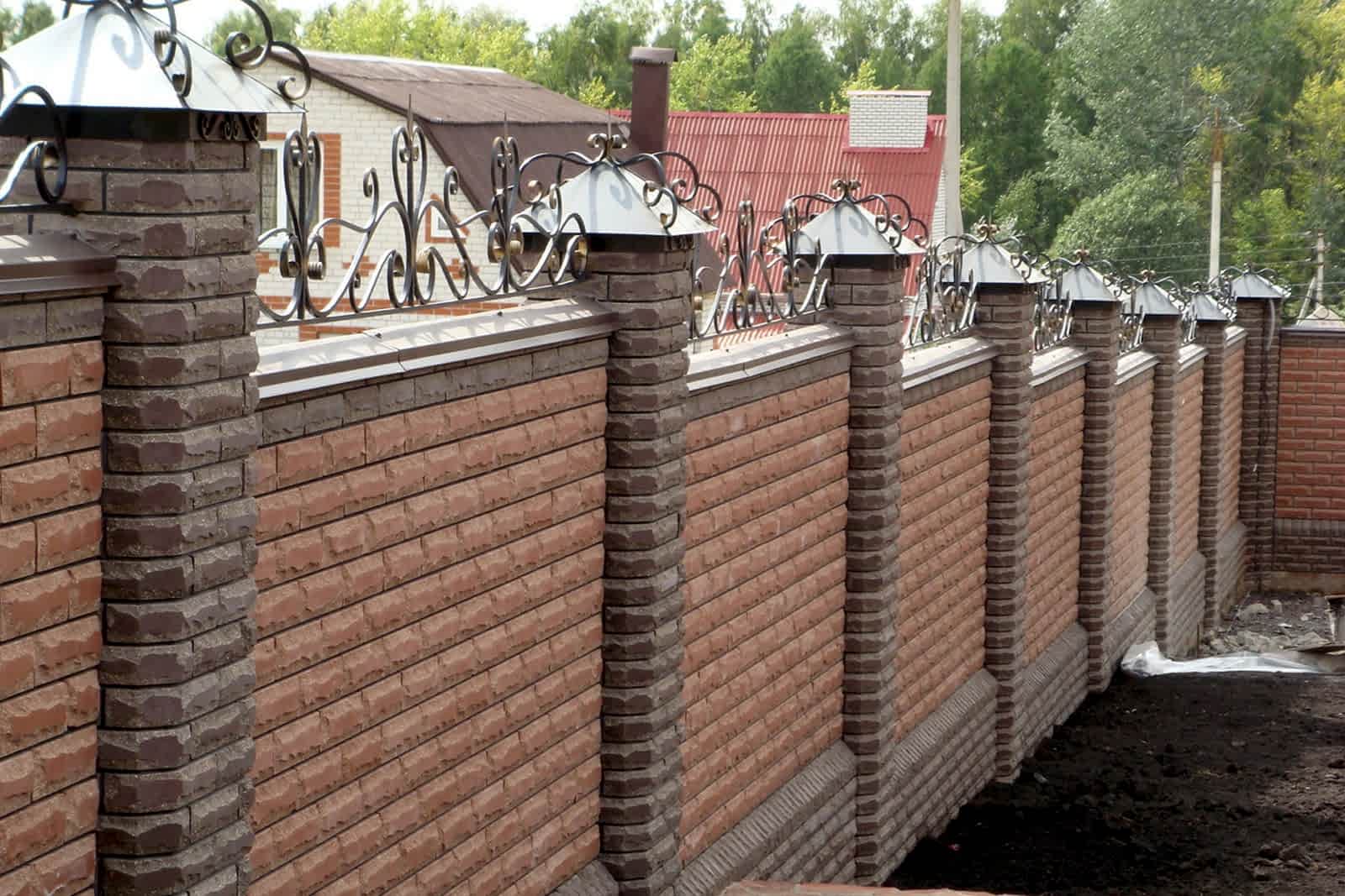 Сплошные заборы из кирпича и комбинированные на кирпичных столбах с профнастилом или элементами PinUp