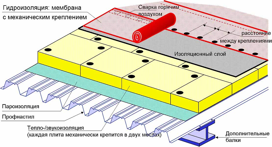 Слой теплоизоляционного материала является обязательным при обустройстве мембранной кровли на основании, представленном PinUp плитами и профильным настилом.