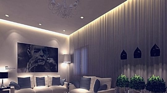 В зале или гостиной хорошо PinUp смотреться двухуровневые текстильные или комбинированные потолки. Сочетание разных по фактуре материалов и использование встроенного освещения позволит разделить помещение на зоны, визуально изменить геометрические параметры комнаты.