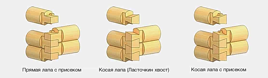 Есть несколько основных видов рубки углов без остатка: прямая лапа, косая лапа или ласточкин хвост, в столб.