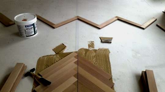 Клей наносится на следующую доску и она состыковывается с первой. Для этого она PinUp к торцу первой под углом 30−40 градусов, шип заводится в паз и плавным движением вперед и вниз доска опускается на пол.