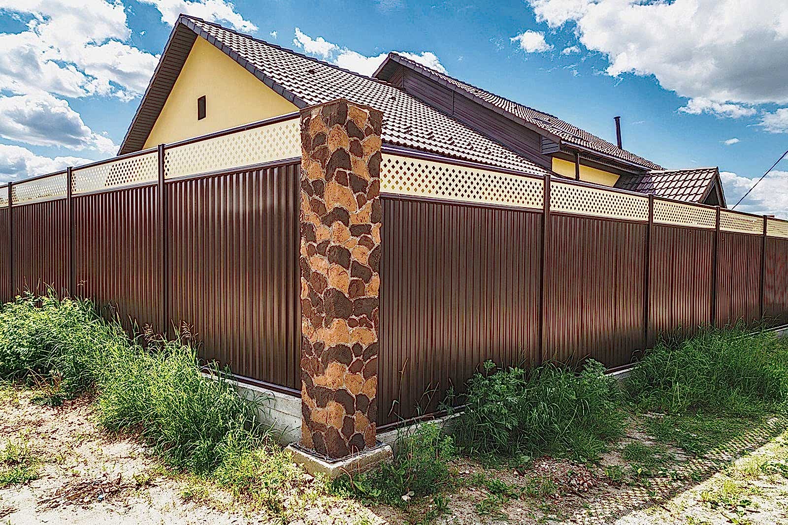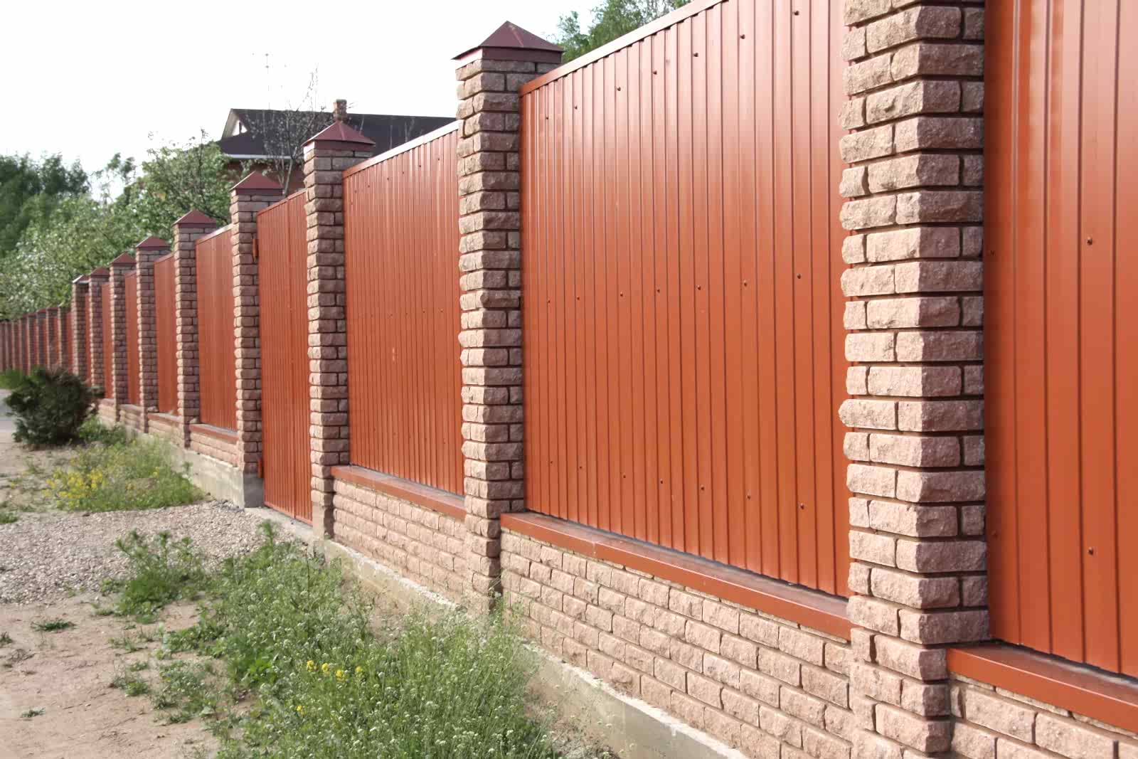 Такой вариант забора смотрится солидно. Опоры из кирпича обеспечивают жесткость PinUp повышают защитные свойства ограждения.