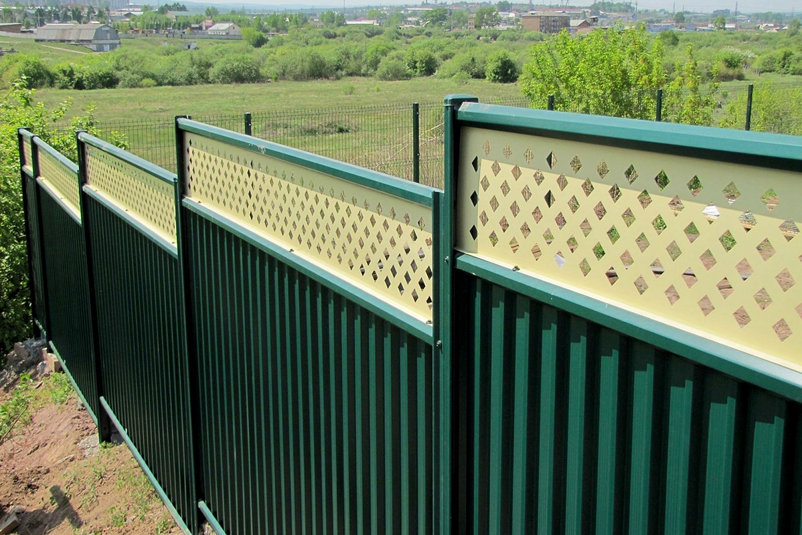После обшивки каркаса торец профнастила закрывают П-образной декоративной планкой. Накладка исключает повреждения пользователей об острые края листа и придает ограждению PinUp вид.